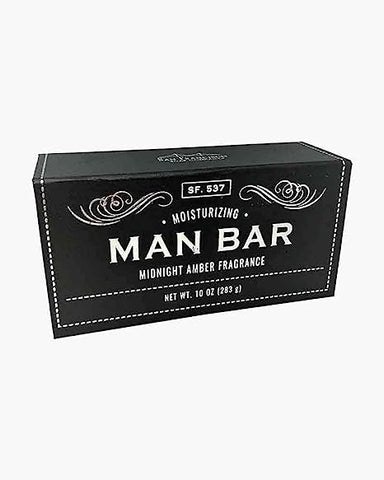 Man Bar Soap with moisturizing benefits and unique masculine fragrance in leather textured box.