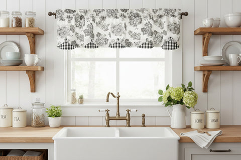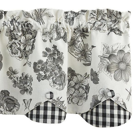 The Black Check Geranium Layered Valance tastefully combines layers of black and white geraniums, dragonflies and butterflies fabric, black and white check scallops, and black and white check buttons. It's the perfect blend of farmhouse elegance and country cottage charm. Lined with 100% white cotton.