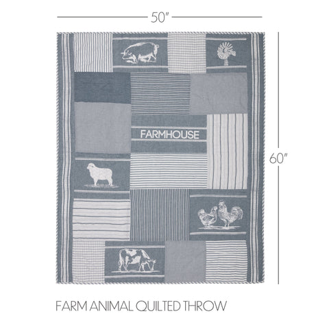 Mismatched patchwork blocks in a variety of simple denim blue and white plaids and stripes complement stenciled accents to create a modern farmhouse look you're sure to love. Our Farmstead Blue Farm Animal Quilted Throw measures 60x50 inches and adds country chic style to any sofa, chair or wall. The detailed throw features a soft, quilted design with rectangular blocks in a variety of sizes and a thin, striped border. A central block features word art stenciling in a bold font reading, farmhouse. Smaller blocks sprinkled throughout the patchwork include classic farm scenes, including livestock and a windmill, in clean white stenciling for a bright farmhouse feel. The premium lap blanket is machine washable and iron safe and crafted in 100 percent cotton for a soft feel and durable wear. Reverses to a simple blue and white ticking stripe for alternate styling.