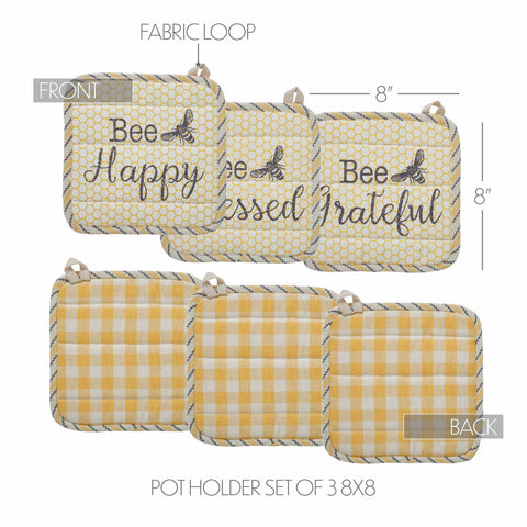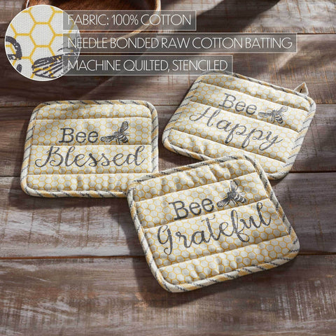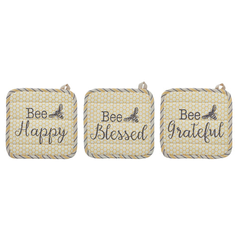 - Vintage Charm: The Cotton Pot Holder Set of 3 from the Buzzy Bees Collection combines vintage charm with modern functionality with adorable Bees and saying 'Bee Happy", "Grateful", and "Blessed".