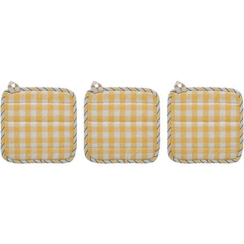 Elevate your kitchen decor with our Cotton Pot Holder Set of 3 from the Buzzy Bees Collection, a charming and vintage-inspired addition to your culinary space. These square 8x8-inch pot holders boast a primitive yet timeless design that combines warmth and functionality. Crafted in a durable flat weave, these pot holders not only offer reliable heat resistance but also feature a delightful that exudes nostalgic charm. Whether used on the table, or simply adding a touch of vintage warmth to your kitchen, these pot holders with their bee-themed graphics emblazoned with "Bee Happy," "Grateful," and "Blessed" make a statement. The Vintage Yellow color of these pot holders adds a touch of retro elegance, creating an inviting atmosphere in your kitchen. Whether you're cooking up a storm or simply needing to protect your hands from hot cookware, these pot holders provide a perfect balance of style and practicality. Their vintage appeal, combined with the flat weave construction, makes them an ideal choice for both everyday use and special occasions, adding a unique and charming touch to your home. The Buzzy Bees Collection's pot holders offer a distinctive way to infuse your kitchen with character and warmth, making them a wonderful addition to your culinary space. Their primitive design, vintage yellow hue, and delightful graphic/print all come together in perfect harmony, transforming your kitchen into a welcoming haven for cooking and baking. Enjoy heat-resistant protection with a hint of nostalgia - a great choice for any kitchen enthusiast.