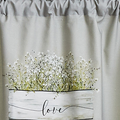 Our farmhouse country Bouquet of Grace Valance has soft Dove Grey, accented with designs of baskets filled with Field Flowers. Each Crock reads: "love". What a wonderful way to express your love and closeness. A perfect back drop for your home.