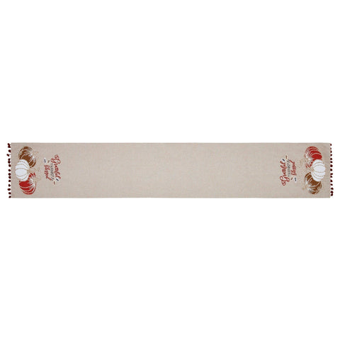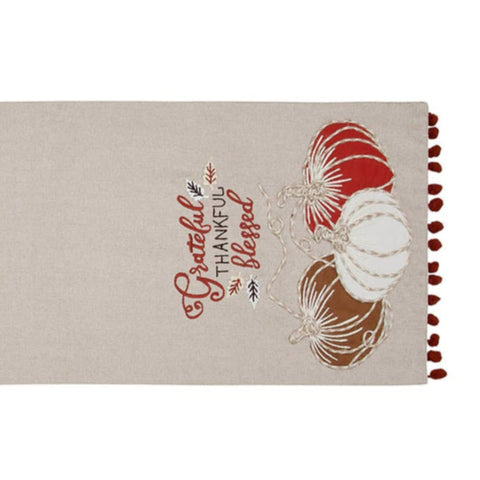 • Featuring an embroidered design showcasing the words "Grateful, Thankful, Blessed" alongside a trio of pumpkins in taupe grey, pumpkin orange, and chocolate brown hues, this table runner evokes the spirit of gratitude and harvest celebrations.