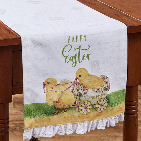 Create a joyful Easter atmosphere with our Joyful Easter Table Runner 36" adorned with cute chicks and vibrant spring flowers. Its "Happy Easter" message will bring warmth and cheer to your holiday celebrations. Add a touch of whimsy and delight to your table setting!