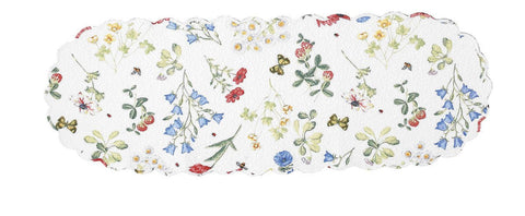 Add country floral charm to your table with the Meadow Flowers Quilted Table Runner. Featuring scalloped edges and variety of wildflowers and butterflies on white fabric with quilting.