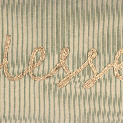 The country Sage Winds Blessed Pillow is a delightful reminder to all. The sage and khaki striped base all-cotton features "blessed" embroidered in natural jute rope, framed in creme lace detail, and trimmed with 1.5" natural burlap gathered ruffle. Reverses to sage and khaki stripes and 2 dark wooden button closures.