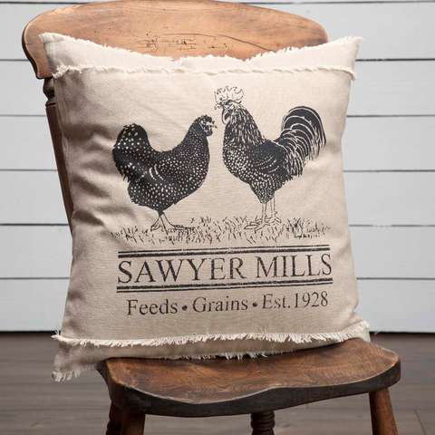 For a country farmhouse inspired look, try the Farmstead Charcoal Poultry Pillow. Over its all cotton khaki chambray is a rooster-themed black stencil in the center. Reverses to solid khaki chambray and 2 tie closures.