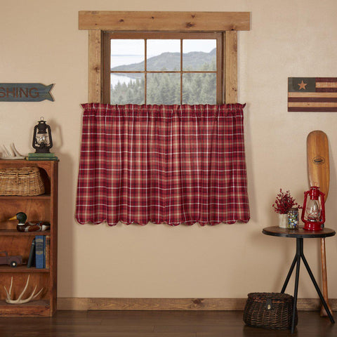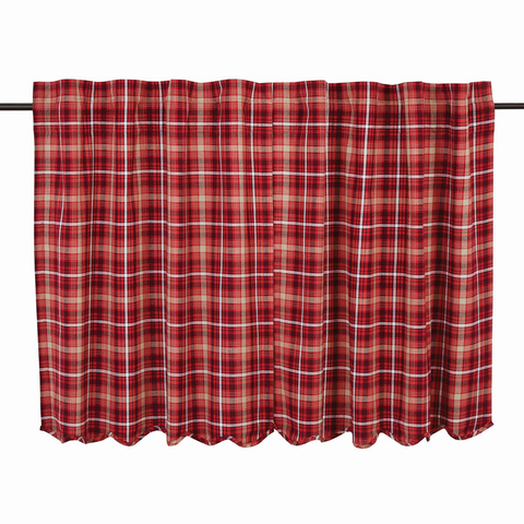 Embracing traditional American plaid, the Braxboro Scalloped Tier Set inspires primitive and rustic Americana looks with its apple red, tan, and ebony black color on all cotton fabric. The scalloped edge lends a soft feel, while the vibrant hue of these L36xW36 country curtains brings warmth to your living room, dining room, or kitchen. A white lining on the back of our curtains help filter light, and a rod pocket makes hanging convenient and easy.