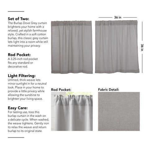 With exceptional versatility and simplicity, the Burlap Dove Grey Tier Curtain Set brightens your home in a calming vintage style. Crafted in a soft cotton burlap and finished with a standard 2-inch hem fold at the bottom, these classic grey curtains let the light into a room while still maintaining your privacy. Place our relaxed yet fashionable country curtains in the living room, dining room, kitchen, or bedroom to transform a room with cozy texture. Machine washable and iron-safe, this warm, rustic 100% cotton curtain set comes with two tiers that have rod pockets for easy hanging.