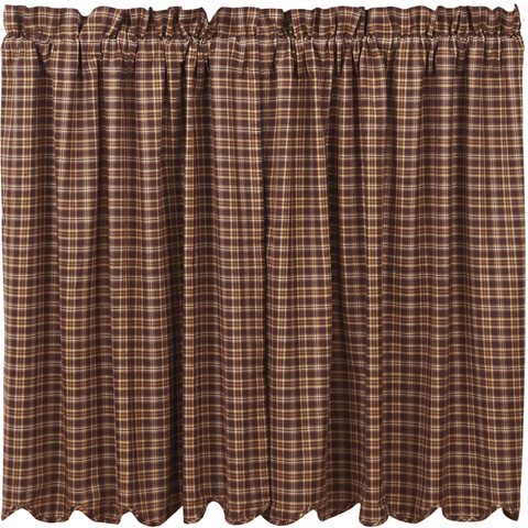 Create a stunning rustic look with the Preston Scalloped Tier Set. Showcasing an earth-toned brown, light tan, and creme plaid, these tiers warm your living room, dining room, or kitchen decor with homespun polish and woodsy color. Machine washable and iron-safe, this set includes two L36xW36 tier curtains crafted in 100% cotton. Our soft country curtains have a white lining to help prevent the sun's glare from shining into your eyes while still letting in some light.
