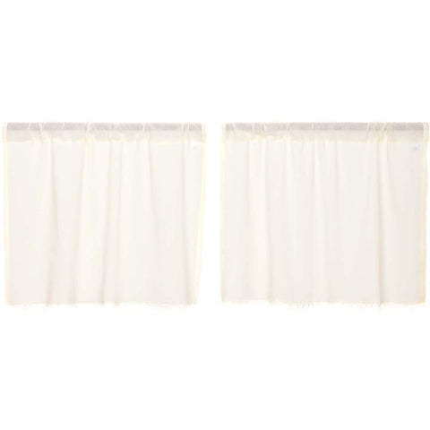 The Tobacco Cloth Antique White Fringed 24" Tier Set features a lightweight antique white (off-white light cream) tobacco cloth fabric. Unlined.