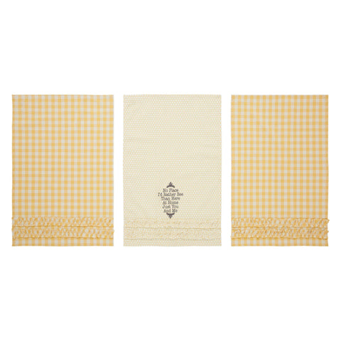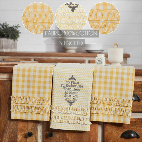 - The honeycomb pattern on Towel 1 showcases bees and states "No Place I'd Rather Bee Than Here At Home Just You And Me", with check pattern and ruffles on the other two, making them a delightful addition to your kitchen decor.