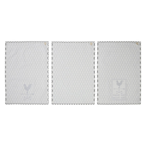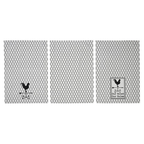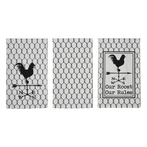 - You know who lives here! Towel 1 says "Our Roost Our Rules" under a Rooster Weathervane. Towel 2 showcases a Rooster Weathervane and Towel 3 is a chicken wire detail.