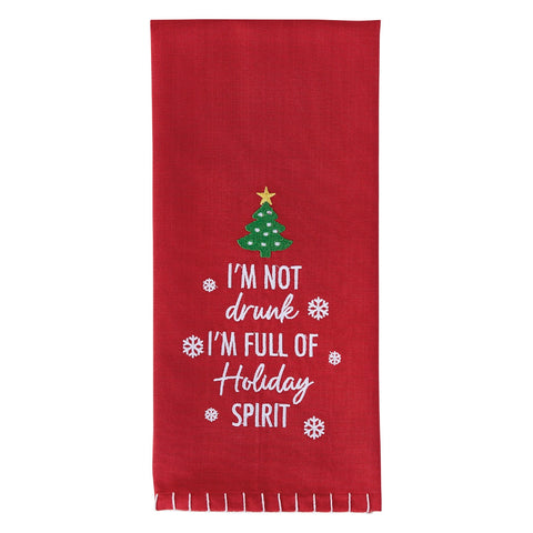 Welcome the Christmas season into your home with our embroidered Full Of Holiday Spirit dishtowel. Featuring the catchy phrase "I'M NOT drunk I'M FULL OF Holiday SPIRIT" on a red towel.