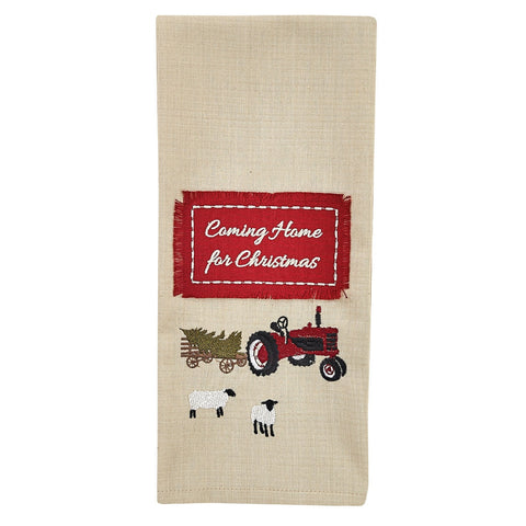 Welcome the Christmas season into your home with our embroidered Home For Christmas dishtowel.  Features a tractor with a wagon carrying a tree with sheep close by and the phrase "Coming Home for Christmas" in a decorative red fringed box.