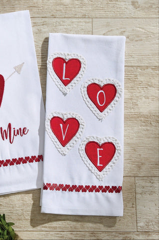 The embroidered Love Decorative Towel adds a punch of Valentine's Day color to your farmhouse or country kitchen! White and red cotton featuring embroidered hearts and 'love' motif and trimmed with lace.