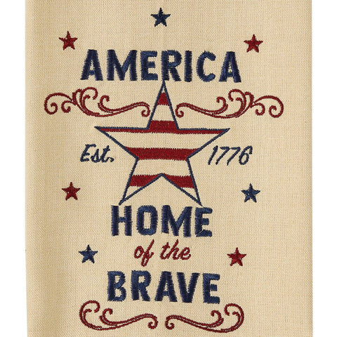 Show your patriotic spirit with Our Flag & Home of the Brave Dish Towels. They feature red, tan and blue colors and memorable sayings.
