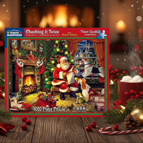 This Santa puzzle makes a great gift or a colorful seasonal decoration. With stockings hung by the fireside and eager eyes looking on, Santa takes time out and reviews his list before his next stop. He still has plenty of White Mountain Puzzles gifts in his bag he needs to deliver. Artist: Howard Robinson. 1000 piece jigsaw puzzle: Finished size 24" X 30".