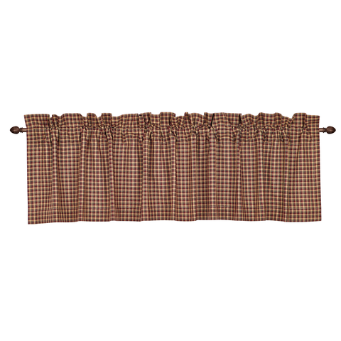 The country Primitive Patch Plaid Valance is 100% yarn-dyed woven cotton plaid. Dominant colors are deep red, khaki, navy. Lined, with 2" headers and 3.25" rod pocket.