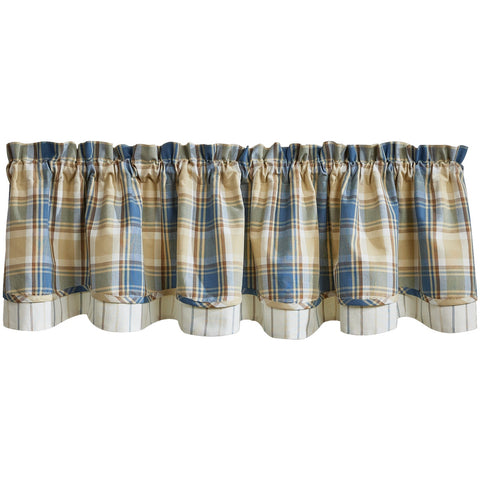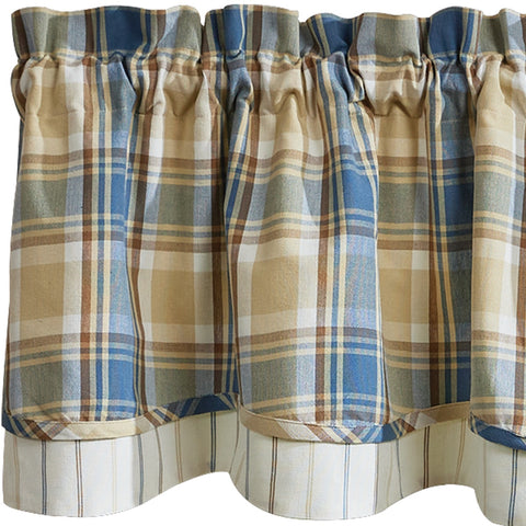 The Hollowstone Layered Valance tastefully combines brown, tan, blue and white layered on vertical ticking stripes. It's the perfect blend of farmhouse elegance and country charm. Lined with 100% white cotton.