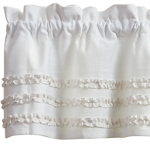 Add a touch of classic country style to your window with our Triplicity Ruffled White Valance. Displaying exquisite, modern design with 3 ruffles, it's perfect for your updated country style home. Curtains include rod pocket for easy hanging.