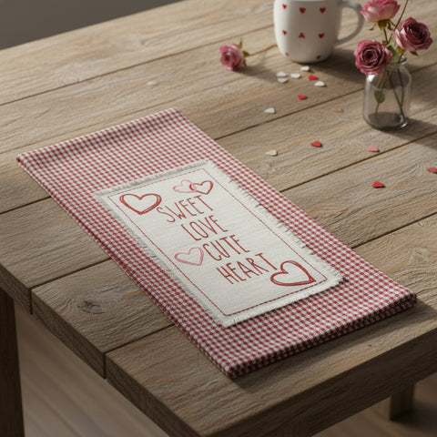 The embroidered Gingham Heart Applique Towel adds a punch of Valentine's Day color to your farmhouse or country kitchen! Red and ivory cotton gingham check featuring an appliqued and embroidered message "Sweet Love Cute Heart".