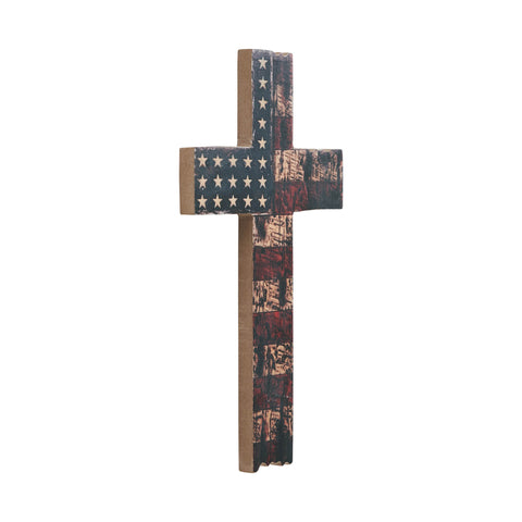 Celebrate your faith and patriotism with the VHC Brands Patriotic American Flag On Distressed Cross MDF Wall Sign 10x6. This decorative piece features a striking design with a tattered cross adorned in a flag theme of navy blue, deep red, and tan. The distressed finish adds a rustic, vintage charm, making it an ideal addition to your Independence Day celebrations or as a year-round expression of your love for faith and country. Perfectly suited for any room, this cross-shaped wall sign enhances the decor of living rooms, dining rooms, kitchens, bedrooms, bathrooms, or entryways. Its classic Americana color palette and distressed appearance pair beautifully with rustic farmhouse and country-style interiors, adding warmth and character to your space. The unique combination of patriotic and faith-inspired elements makes it a meaningful statement piece for any occasion.Ā
