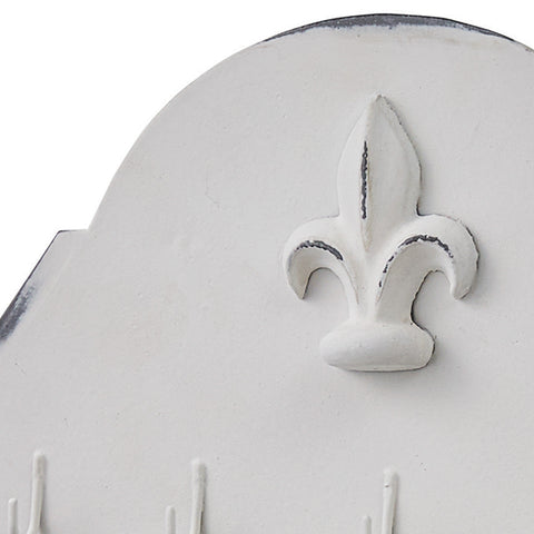 Our Layne Metal Wall Pocket adds a farmhouse french country touch to your space with its distressed white finish.  Get organized - includes 5 key hooks and 2 letter pockets to store your essentials.  Accented with a white fleur de lis.