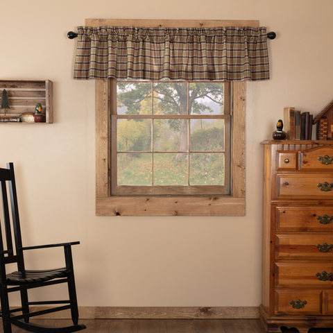 The Wattsyn Valance Lined is sure to bring a simple rustic touch to your country home. Wattsyn is comprised of the beautiful colors of khaki, black, and moss green plaid.