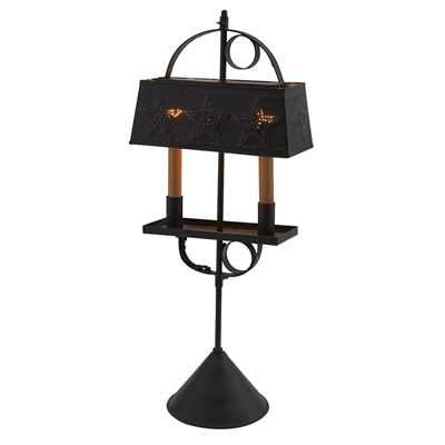 Our Franklin Taper Adjustable Lamp was inspired by a candle lamp that allowed the shade to adjust based on the amount of light desired. A wonderful adaptation of a colonial style sure to add historical interest and warmth to your country, primitive or farmhouse decor. A punched star motif accents the lampshade and two deep tan tapers produce the lamp’s warm glow with 25-Watt bulbs. .
