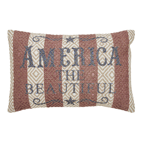 Celebrate the spirit of Independence Day with the Patriotic America The Beautiful Pillow 14x22. This elegant rectangular throw pillow features "America The Beautiful" stenciled in navy blue on a striped base of burgundy and tan. The intricate jacquard-woven texture adds a layer of sophistication, making it a standout accent for your home decor. Designed with a button closure on the back, the cover securely holds the pillow insert for easy styling and maintenance. Perfect for enhancing your living room, bedroom, or entryway, this versatile pillow brings warmth and charm to any space. Its rich burgundy, light tan, and navy blue color palette complements rustic farmhouse and Americana-inspired interiors. Whether displayed on a sofa, armchair, or entryway bench, it creates a welcoming atmosphere ideal for Fourth of July celebrations or year-round patriotic displays.Ā