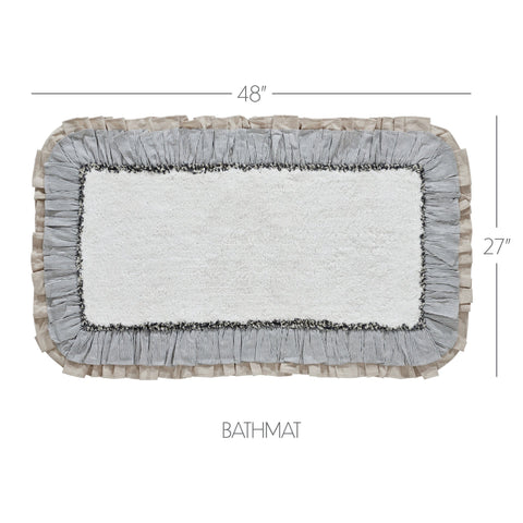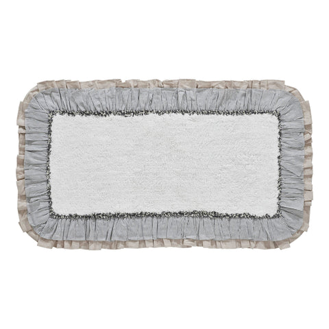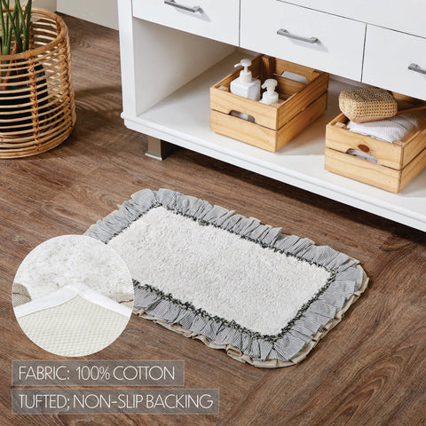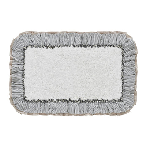 Step out of the shower and into cozy country farmhouse bliss. The Ashlynn Bath Mat features a solid creme core in premium, ultra absorbent cotton. It is trimmed with a ruffled ticking stripe fabric in warm grey and creme. Backed with textured rubber to produce a quality, non-slip surface without the need for a separate rug pad. This ruffled bath mat is a great finishing piece for bathrooms or laundry rooms where you need the perfect balance of style and functionality.