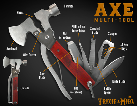 "The Axe Multi-Tool is ideal for camping, fishing, or any number of small home DIY projects. Be prepared for just about any emergency with this tool. With over 15 functions, this is a great gift item for the outdoorsman. "