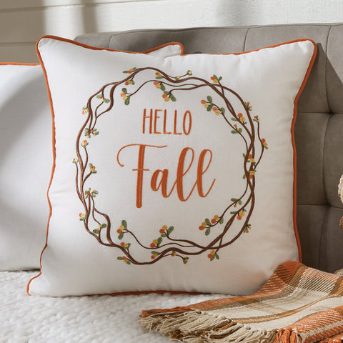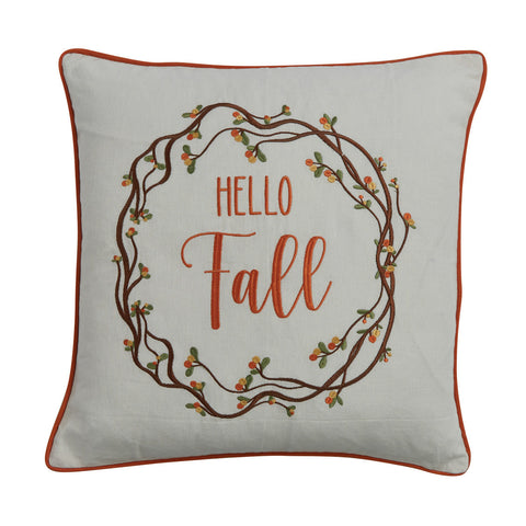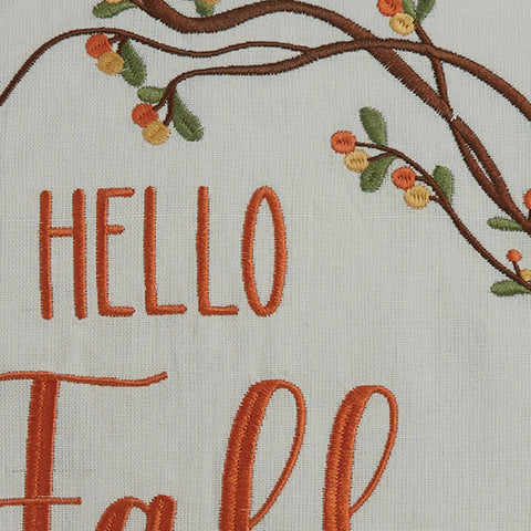 Complement your Fall Farmhouse with our Bittersweet Embroidered Pillow. Features the beautifully embroidered bittersweet in the Fall colors of orange, green, brown, and yellow on a neutral white pillow background with the embroidered words " Hello Fall". Great addition to your Country Home!