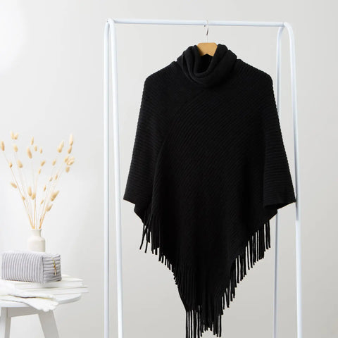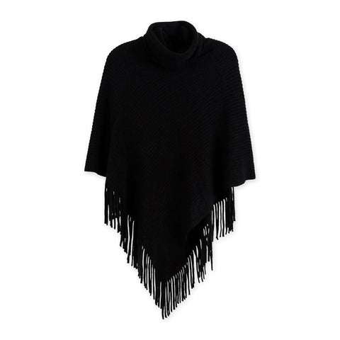 The Black Margo Poncho is a versatile layering piece ideal for transitional weather and everyday wear. Made from a mid-weight ribbed knit, it offers warmth without added bulk. The sleeveless silhouette layers easily over tops and sweaters, while the rolled neckline provides styling flexibility—fold for structure or leave unrolled for a relaxed look. Finished with an asymmetrical hemline and soft fringe for added movement and a flattering drape.