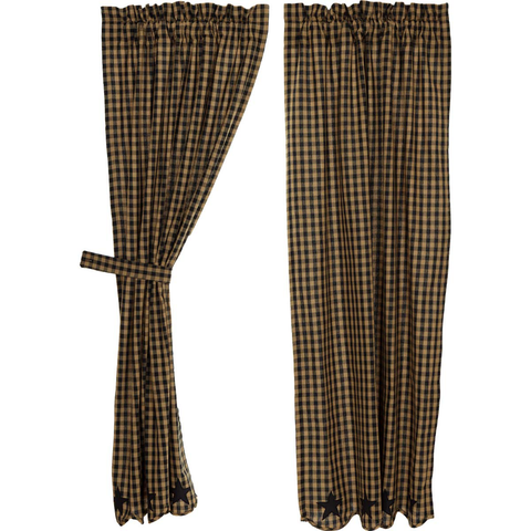 The Blackstone Farm Star Scalloped Short Panel Curtain Set features small scale black and khaki check fabric with 5-point stars appliqued along the bottom in solid black.