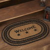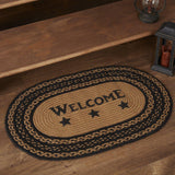- 5-POINT STAR: This rug contains three solid black stenciled 5-point stars aross center with stenciled "Welcome", accented with solid and mixed outer border braids in black and dark tan