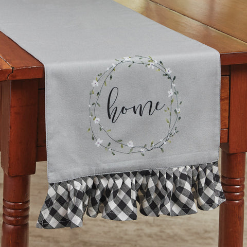 Our farmhouse Bouquet of Grace Table Runner with fresh light colors, trimmed in black and white ruffled check. High Quality, with lined backing. This adds another touch of color and pattern to any space in your home. Accented with country wreath, with the words: "family" or "home" on either end. 13 x 54" 100% Cotton. Lined backing.