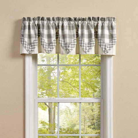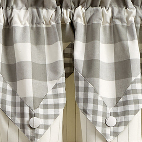 Add a touch of classic, farmhouse style to your window with the Buffalo Grey Check Point Valance. Displaying exquisite, modern design with large scale grey and white checks, gingham checks, buttons and layered over grey and white ticking fabric, it's perfect for your updated country style home. Curtains include rod pocket for easy hanging.  Lined with white cotton.