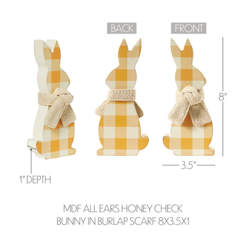 Introducing the Bunny Hop All Ears Honey Check Bunny 8" a charming addition to your spring and Easter decor collection. This delightful bunny figurine is beautifully painted in a honey yellow and antique white plaid pattern, bringing a touch of farmhouse and country charm to your home. Its adorable design is further enhanced by a cotton burlap scarf, adding a rustic and cozy feel to its appearance. Crafted from high-quality MDF, this bunny figurine features a vibrant digital print plaid pattern that stands out in any setting. Its versatile design makes it a perfect accent for various rooms in your home, including the bathroom, bedroom, dining room, entryway, kitchen, and living room. The warm honey yellow and antique white hues blend effortlessly with any spring or Easter-themed decor.