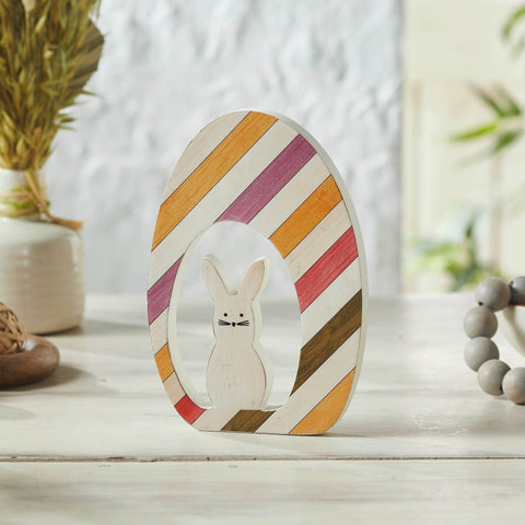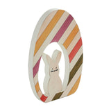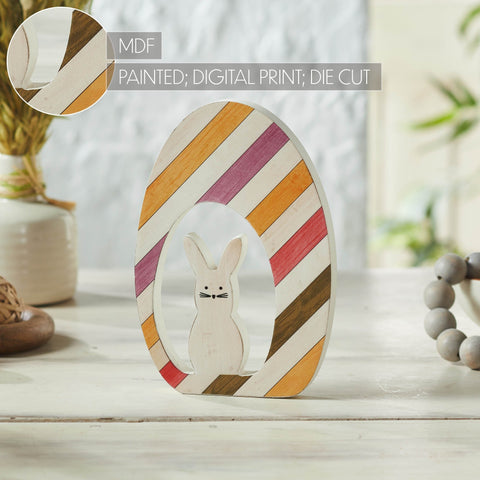 - Distinctive Design: Bunny cutout set within an Easter egg featuring yellow, purple, and green stripes against a worn white backdrop.