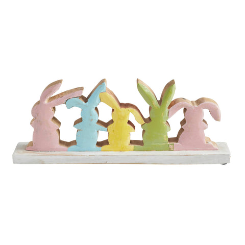 - Charming Bunny Display: Features five adorable bunny silhouettes in blush pink, turquoise blue, sunshine yellow, and green, arranged in a playful lineup on a creme base.