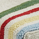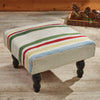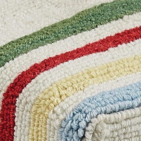 The Camp Stripe Hooked Stool features colored stripes. The stool is a versatile size at 9"H x 16"W x 16"D. Hooked top is hand crafted of polyester yarn.