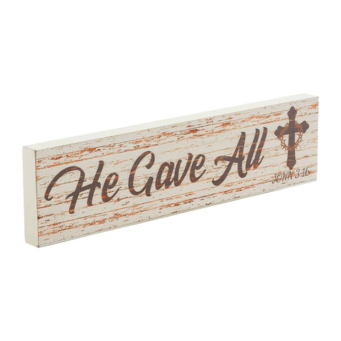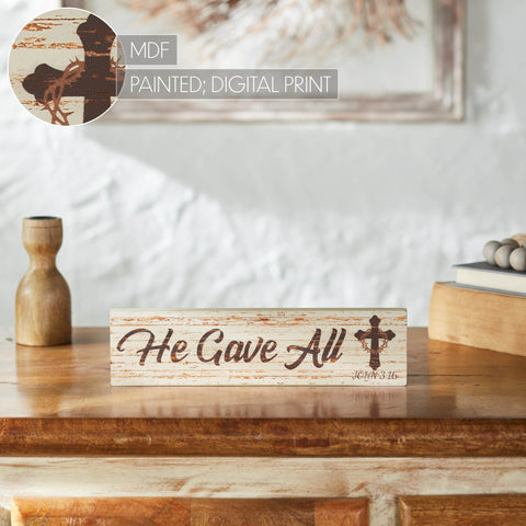 The Celebrate Grace He Gave All with Crown of Thorns on Cross Wall Sign offers a poignant reminder of sacrifice and faith for your spring and Easter decor. Measuring 2.75x11 inches, this wall sign features the powerful phrase "He Gave All" alongside an intricately detailed cross adorned with a crown of thorns. The scripture reference "John 3:16" is elegantly displayed in grey against a distressed cream base, making this piece a meaningful tribute to the ultimate act of love and redemption. Crafted from MDF, this sign combines a rustic and primitive style with inspirational faith scripture. The digital print process highlights the delicate details of the cross and crown of thorns, while the distressed appearance adds a vintage charm. The aged creme, storm grey, and sable brown colors enhance the sign's timeless appeal, ensuring it complements a variety of home decor themes. Ideal for any room in your home, from the entryway to the living room, this sign serves as a constant source of spiritual encouragement.Â