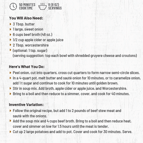 Frontier Soups Chicago Bistro French Onion Soup with black lentils and sliced onions has substance and nutrition not in a typical French onion soup. Rich and robust on its own or extra luscious with French bread and cheese topping, this gluten free soup is hot and ready in just 50 minutes.
