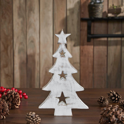 Add a touch of rustic elegance to your winter and Christmas home decor with the Tropical Wood Christmas Tree with Stars White Wooden Figurine. This charming figurine features a cutout Christmas tree adorned with stars, making it a perfect tabletop accent for your holiday arrangements. Crafted from tropical wood, it boasts a natural and soft creme color palette that exudes farmhouse and country-inspired charm. With its farmhouse Christmas aesthetic and distressed appearance, this wooden figurine brings a nostalgic warmth to any space. Whether placed in the bathroom, bedroom, dining room, entryway, kitchen, or living room, it adds a festive touch to your indoor decorations during the winter and Christmas season. The novelty design of the Christmas tree with stars makes it a unique and eye-catching piece that captures the spirit of the holidays. Maintaining the beauty of this wooden figurine is simple - just wipe it clean with a soft cloth to remove dust and maintain its pristine condition. Whether displayed on its own or as part of a larger holiday display, the Tropical Wood Christmas Tree with Stars White Wooden Figurine is sure to enhance the festive ambiance of your home, spreading joy and cheer throughout the holiday season.