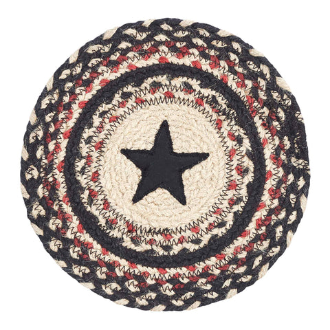 The Colonial Star Braided Trivet Stencil Star 8" sets the primitive table beautifully with alternating black, natural and bright red braids. An appliqued black 5-point star in the center complete the look.