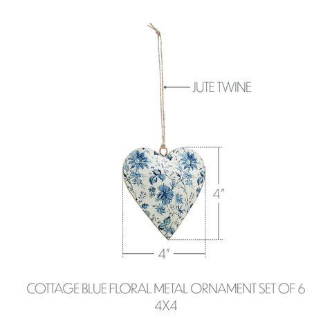 Bring elegance and softness to your holiday decor with the Cottage Floral Metal Ornament Set of 6. Crafted from durable iron, each ornament features a white heart-shaped base beautifully printed with floral and leaf designs in shades of light blue. A bright gold trim adds a subtle touch of sparkle, while the included twine hanger enhances its primitive, handcrafted appeal. These ornaments offer a delicate blend of cottage-inspired charm and festive detail, making them ideal for Christmas trees, garlands, or tabletop arrangements. The calming color palette and vintage floral design provide a refreshing alternative to traditional holiday motifs, perfect for those who favor a rustic or romantic seasonal aesthetic. Perfect for use in the bathroom, bedroom, dining room, entryway, kitchen, or living room, this set of six heart ornaments adds a gentle, graceful accent to any space. Whether grouped together or styled individually, the Cottage Floral ornaments bring timeless beauty and warmth to your winter decor. For best care, simply wipe clean with a soft cloth.
