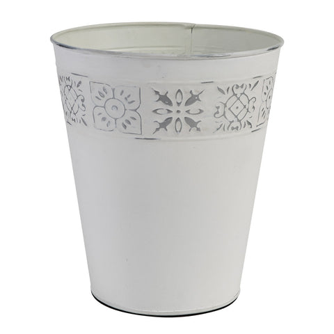 Distressed Tile Waste Basket.  The white-washed finish is perfect for your farmhouse, cottage, coastal or country decor trash can needs.  Sturdy construction made of metal.