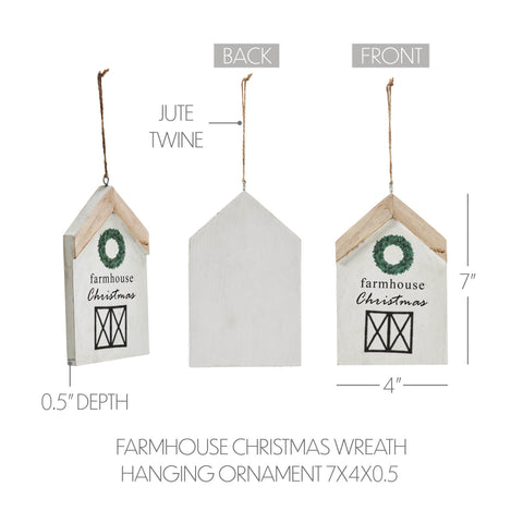 Our  Farmhouse Christmas Wreath Hanging Christmas Ornament is a delightful addition to your holiday decor that brings rustic farmhouse charm to your Christmas tree. Crafted from tropical wood, this ornament features a charming house-shaped design adorned with the words "Farmhouse Christmas" adding a festive and welcoming touch to your seasonal decorations. Measuring 7x4x0.5 inches, it is perfectly sized to hang on your Christmas tree or to display on hooks, doorknobs, or anywhere else you wish to spread holiday cheer. With its light creme, Christmas green, and country black color palette, this wooden ornament embodies the cozy and inviting atmosphere of a farmhouse Christmas. The distressed appearance adds to its rustic charm, giving it a weathered look that evokes memories of holidays spent in the countryside. Whether displayed in the dining room, entryway, or living room, this ornament infuses your home with the warmth and joy of the holiday season.